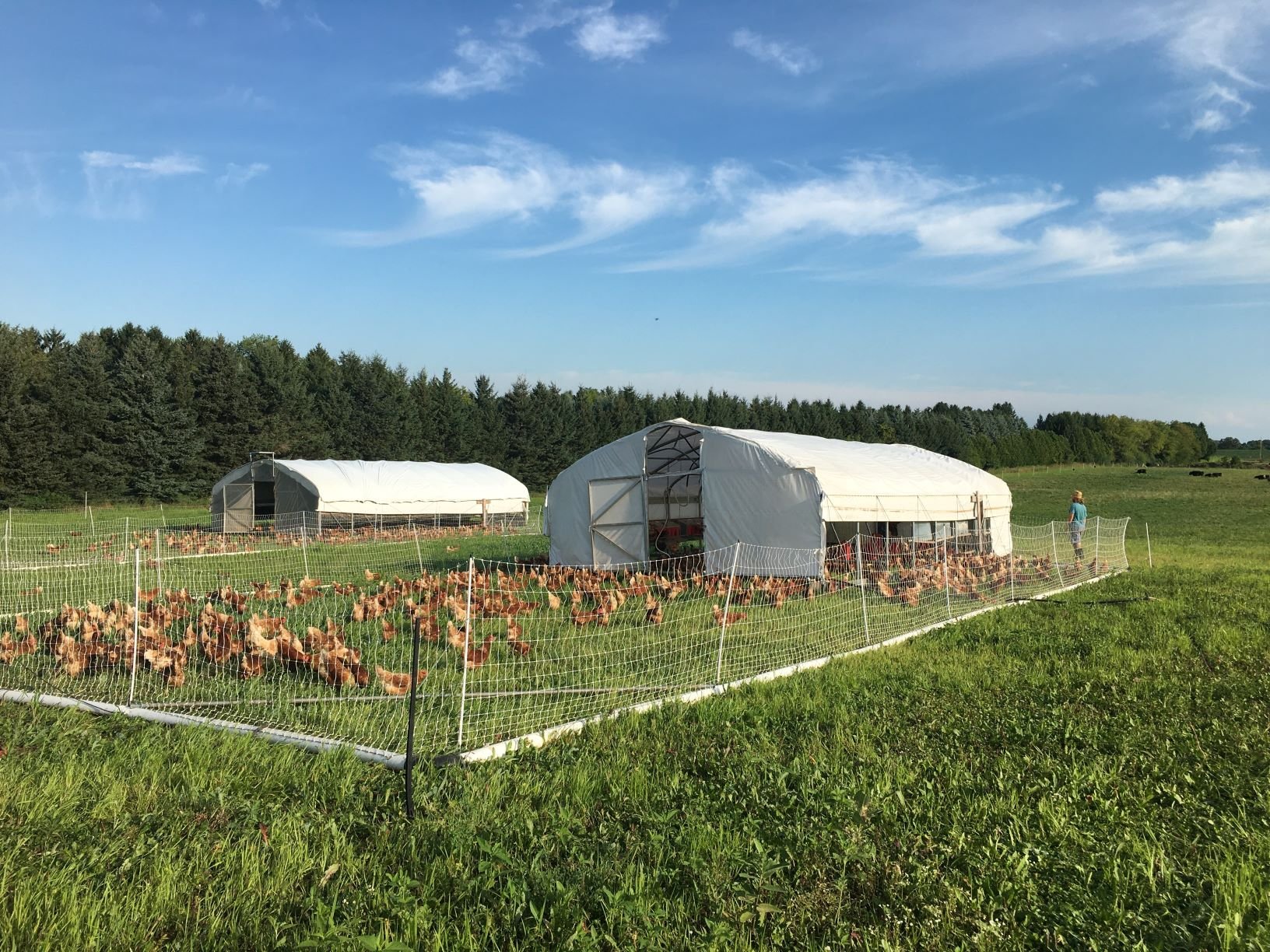 Farmers who raise their chickens on pasture generally have a mobile coop that they move every day and a large electric fence around the coop that they need to move with it to give the birds room to roam and fresh grass each day.
