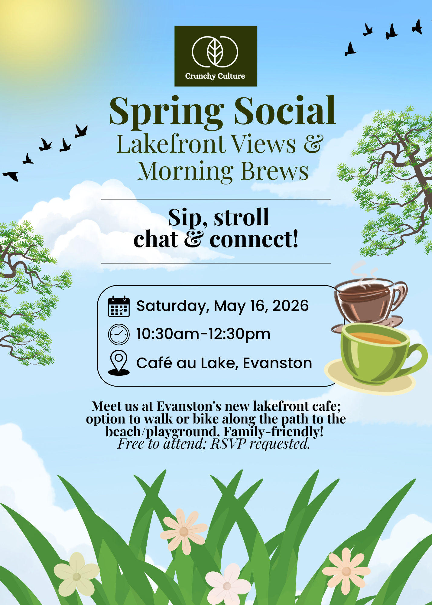 Come meet our community for a casual day out at Cafe au Lake in Evanston from 10:30 AM – 12:30 PM! We’ll enjoy coffee (or tea) and conversation before heading to the nearby beach and playground (optional). Pack a picnic, grab your family, and join us for a fun day by the lake! Free to attend; all ages welcome. Please RSVP for event updates.