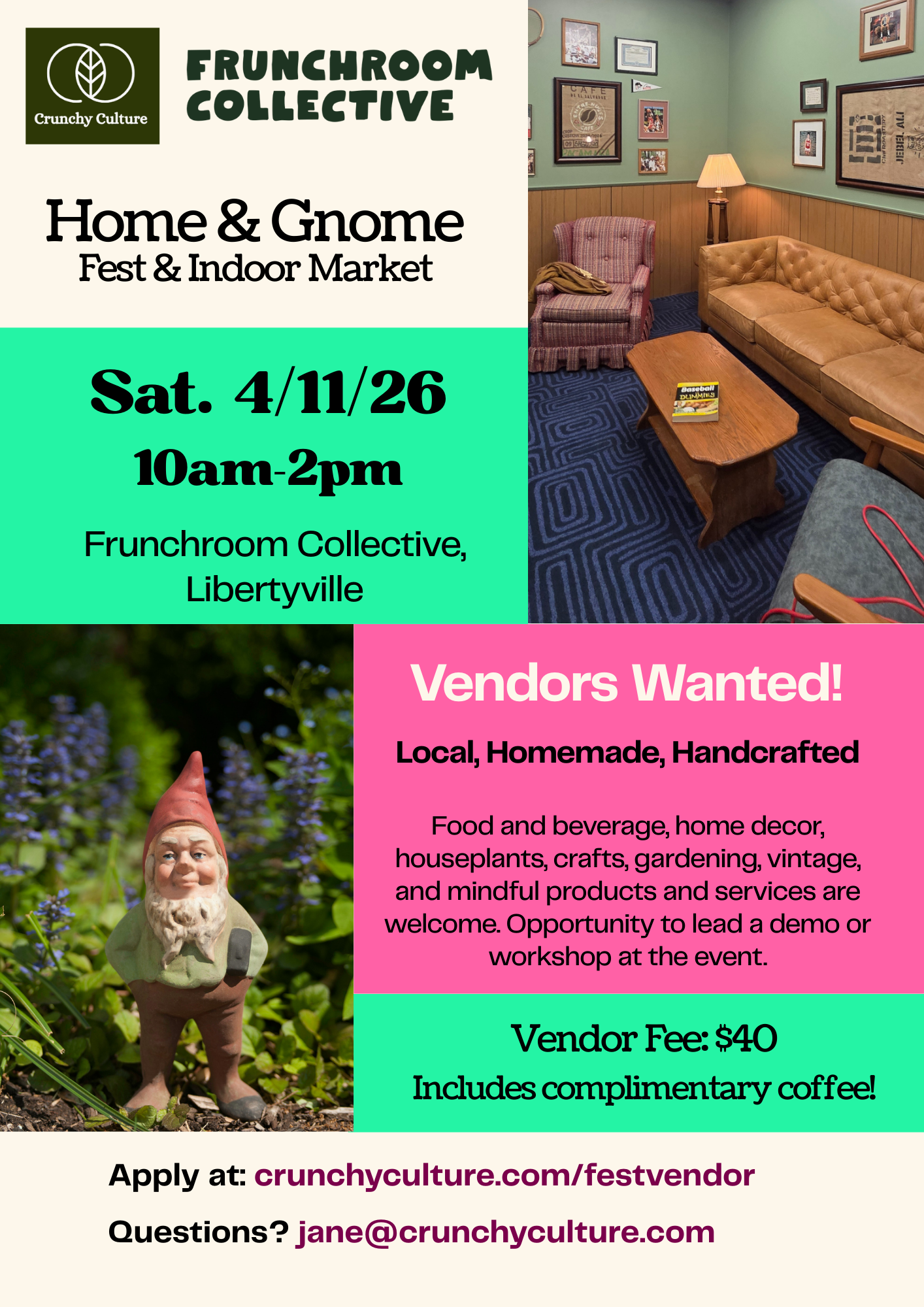 Food and beverage, home decor, houseplants, crafts, gardening, vintage, and mindful products and services are welcome. Includes booth space and opportunity to lead a demo or workshop at the event.